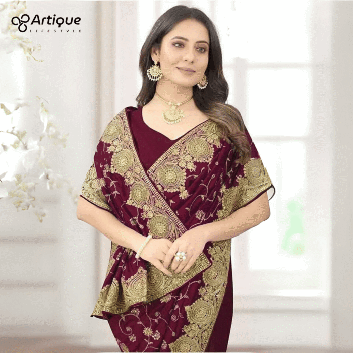 এই মেরুন কালারের শাড়ি টি ইন্ডিয়ান বিচিত্রা সিল্কের ফ্যাব্রিক দিয়ে তৈরী করা এবং সম্পূর্ণ শাড়ির আঁচল ও কুঁচি জুড়ে গোল্ডেন জারি কালার সুতার এমব্রয়ডারি কাজ এটিকে আরও আকর্ষণীয় করে তোলে এবং যেকোনো বিশেষ অনুষ্ঠানের পরিধানের জন্য উপযুক্ত।