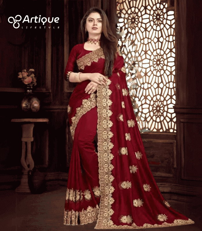 এই মেরুন কালারের শাড়ি টি ইন্ডিয়ান বিচিত্রা সিল্কের ফ্যাব্রিক দিয়ে তৈরী করা এবং সম্পূর্ণ শাড়ির আঁচল ও কুঁচি জুড়ে গোল্ডেন ও মেরুন কালার সুতার এমব্রয়ডারি কাজ এটিকে আরও আকর্ষণীয় করে তোলে এবং যেকোনো বিশেষ অনুষ্ঠানের পরিধানের জন্য উপযুক্ত।