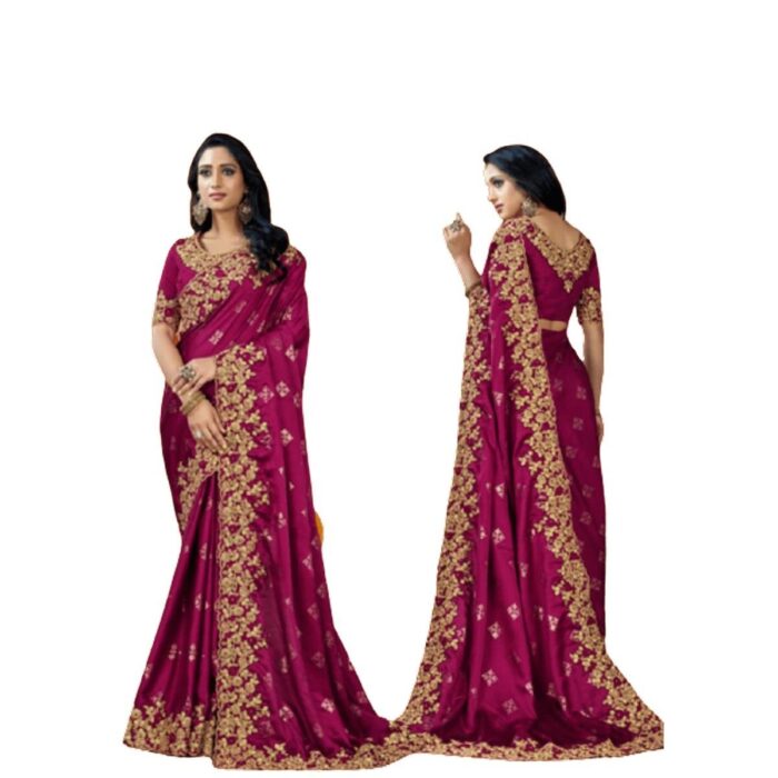 এই কালারের শাড়িটি ইন্ডিয়ান ওয়েটলেস সফট জর্জেট ফ্যাব্রিক দিয়ে তৈরী করা এবং সম্পূর্ণ শাড়ি মেজেন্ডা ও জরি কালার সুতার এমব্রয়ডারি কাজ এটিকে আরও আকর্ষণীয় করে তোলে এবং যেকোনো বিশেষ অনুষ্ঠানের পরিধানের জন্য উপযুক্ত।