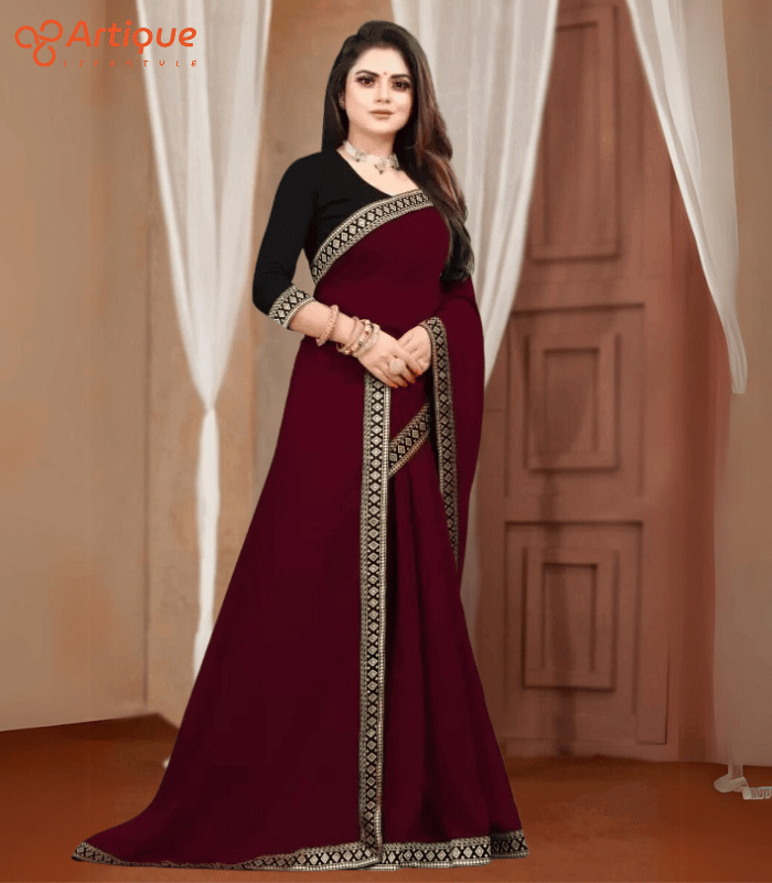 এই মেরুন কালারের শাড়ি টি ইন্ডিয়ান ওয়েটলেস সফট জর্জেট ফ্যাব্রিক দিয়ে তৈরী করা এবং সম্পূর্ণ শাড়ির আঁচল ও বর্ডার জুড়ে কনট্রাস্ট লেইস ওয়ার্ক এটিকে আরও আকর্ষণীয় করে তোলে এবং যেকোনো বিশেষ অনুষ্ঠানের পরিধানের জন্য উপযুক্ত।