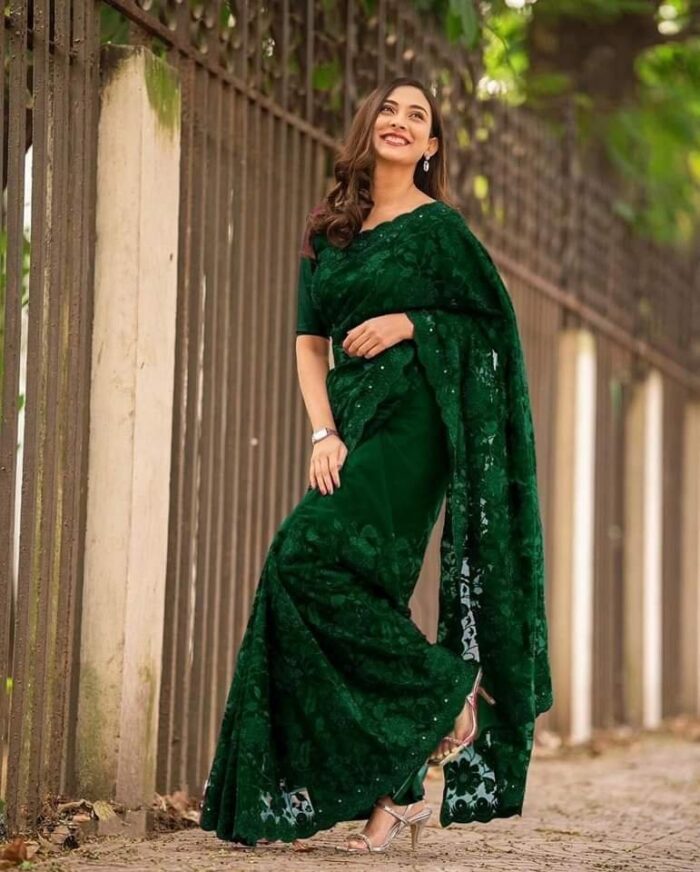 এই কালারের শাড়িটি প্রিমিয়াম অর্গানজা ফ্যাব্রিক দিয়ে তৈরী করা এবং সম্পূর্ণ শাড়ির আঁচল ও কুঁচি জুড়ে ম্যাচিং কালার সুতার এমব্রয়ডারি কাজ এটিকে আরও আকর্ষণীয় করে তোলে এবং যেকোনো বিশেষ অনুষ্ঠানের পরিধানের জন্য উপযুক্ত।