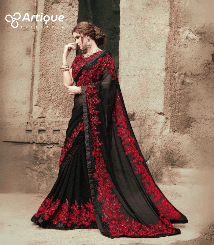 এই কালো কালারের শাড়ি টি ইন্ডিয়ান ওয়েটলেস সফট জর্জেট ফ্যাব্রিক দিয়ে তৈরী করা এবং সম্পূর্ণ শাড়ির আঁচল ও কুঁচি জুড়ে লাল রঙের সুতার এমব্রয়ডারি কাজ এটিকে আরও আকর্ষণীয় করে তোলে এবং যেকোনো বিশেষ অনুষ্ঠানের পরিধানের জন্য উপযুক্ত।